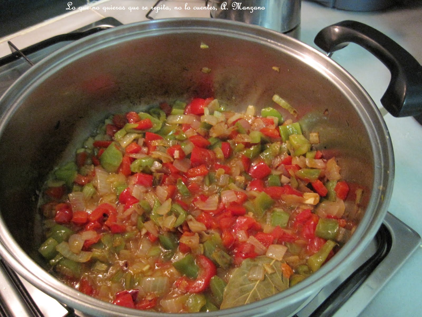 En una cazuela he puesto a pochar la cebolla, el ajo picado, el pimiento rojo y verde, he salpimentado, una vez está todo pochado lo pongo en un recipiente y le paso el turmix (batidora de mano), esto lo hago cuando hay niños en casa.